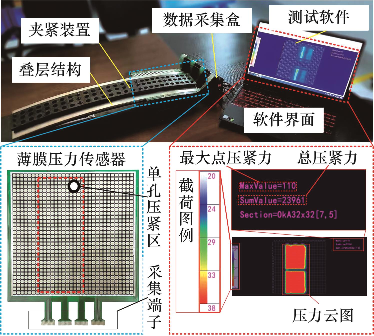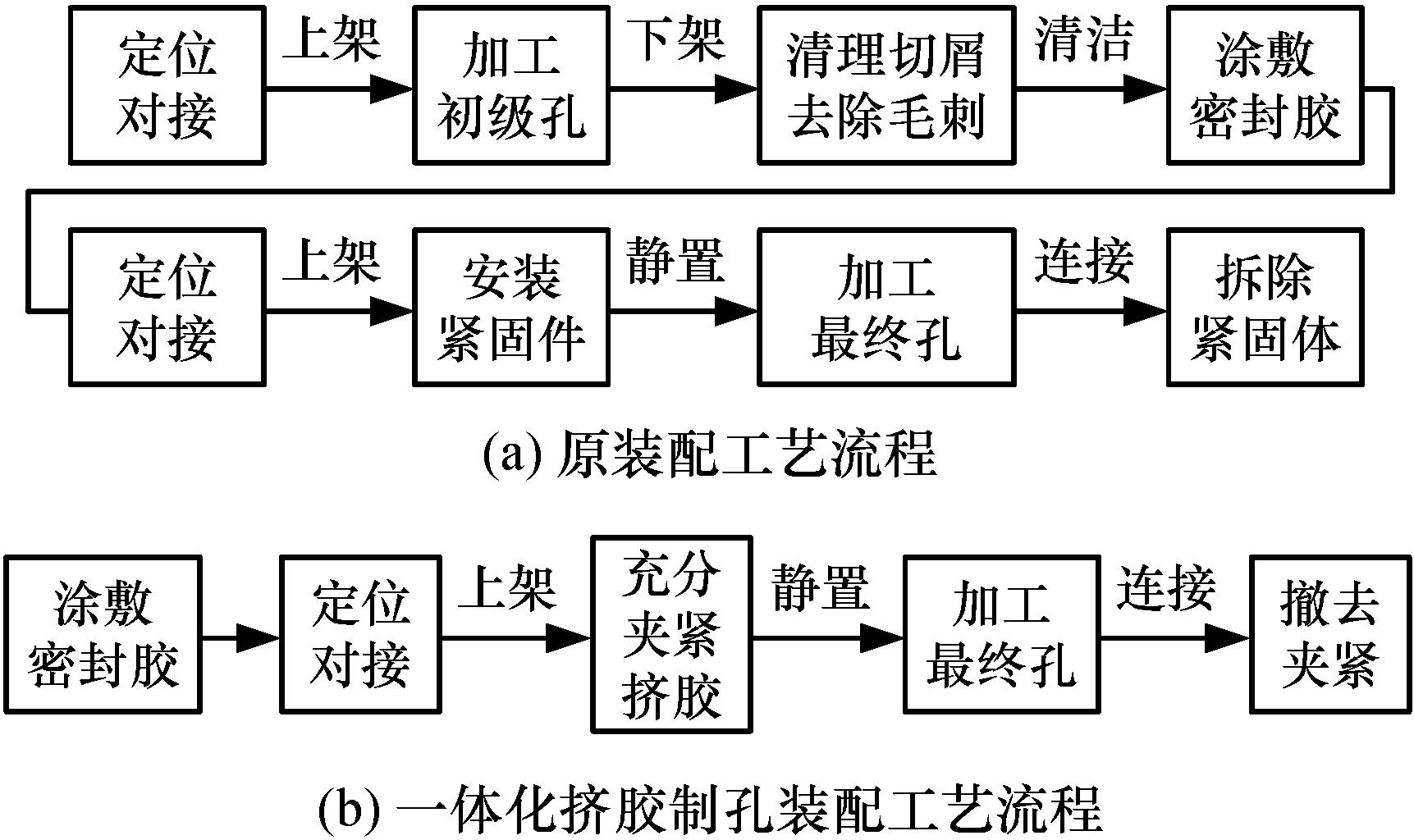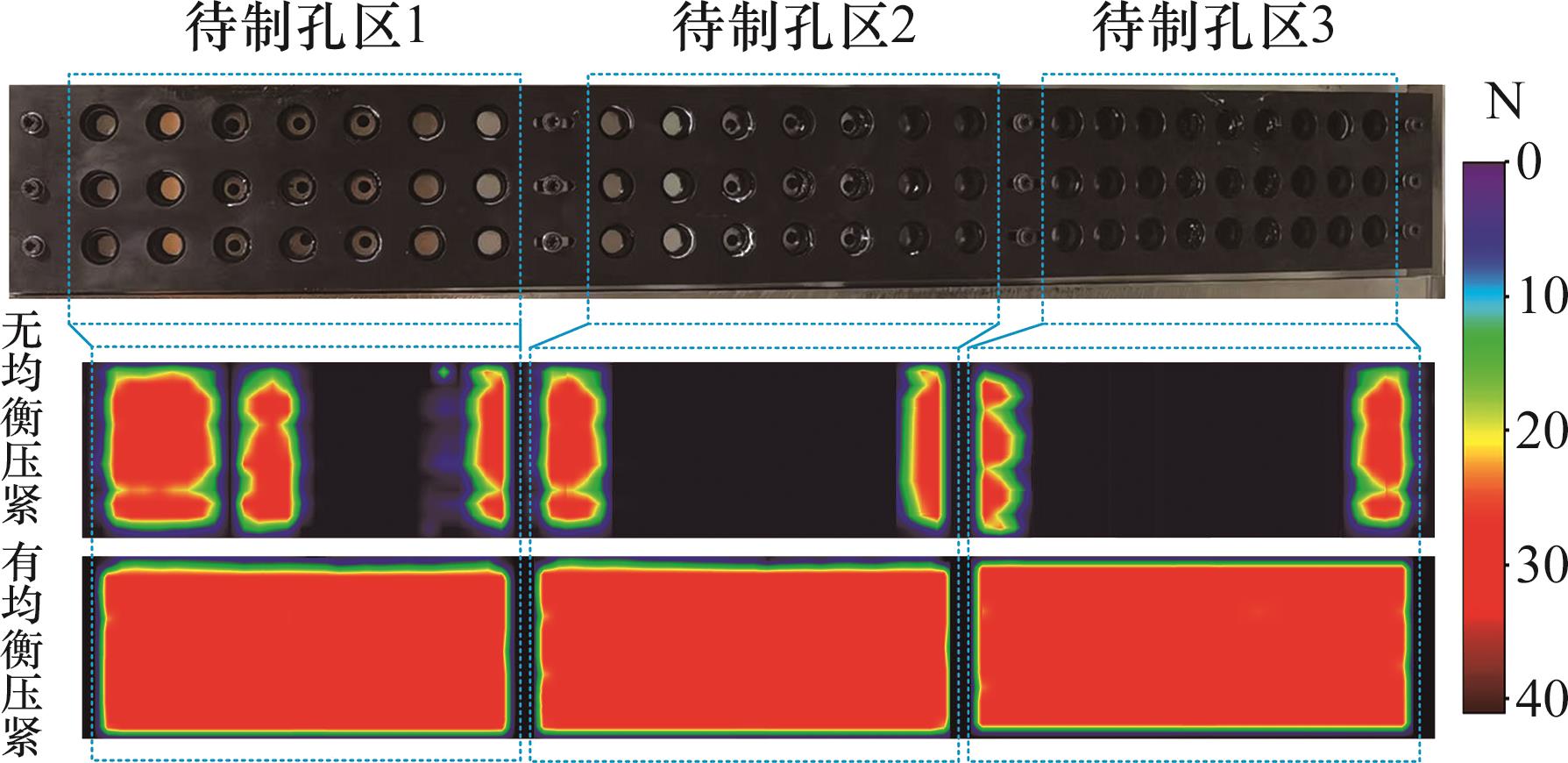 To enhance the assembly efficiency of the fuselage docking areas, an integrated assembly process of sealant extrusion and hole-making was proposed. The process was required to achieve balanced clamping of the docking areas, ensuring the uniform extrusion of the sealant and effectively suppressing the interlaminar gaps caused by hole machining. The typical working condition characteristics of a large civil aircraft fuselage docking areas were taken as an example, and a dual-sided equilibrium clamping device was designed. Using finite element simulation to quantify the unevenness of the interlaminar loads, combined with the minimum single-hole clamping force, the layout of the device's balanced pressing module and the main body materials were optimized. The balanced load tests of the device's docking areas and the integrated sealant squeezing and hole making verification were carried out. Results indicate that the balanced pressing module significantly enhances the uniformity of the clamping loads of the devices. Furthermore, when the hardness of the central rubber pressing ring is increased, the uniformity of the clamping loads is further improved. After selecting Q235 material, which offers better rigidity, for the main body of the devices, the minimum single-hole clamping force in the docking areas reaches 403 N, with an interval load unevenness of 1.4%. The sealant is extruded fully and evenly, and no significant burrs or rolled chips are formed between the layers.