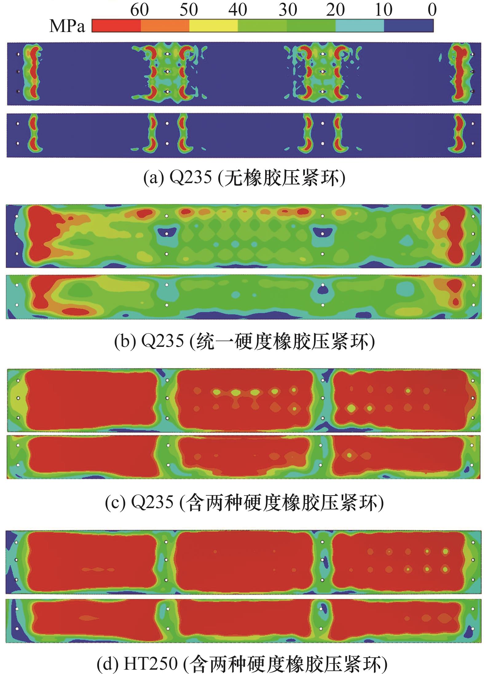 为提高机身对接区装配效率,拟采用一体化的挤胶制孔装配工艺,该工艺需实现对接区的均衡夹紧,保证密封胶的均匀挤出并有效抑制孔加工导致的层间间隙。以某大型民用飞机机身对接区典型工况特征为例,设计了一种双面均衡夹紧装置,通过有限元仿真量化表征区间载荷不均匀度,结合最小单孔夹紧力,对装置均衡压紧模块布局及主体材料进行优化,开展了装置在对接区的均衡载荷测试与一体化挤胶制孔验证。结果表明,均衡压紧模块能够显著提高装置夹紧载荷的均匀性,且随着中间橡胶压紧环硬度的提高,夹紧载荷均匀性进一步改善;装置主体选用刚度更好的Q235材料后,对接区最小单孔夹紧力达到403 N,区间载荷不均匀度为1.4%,密封胶能够充分均匀挤出,且层间未形成明显毛刺和卷入切屑。
