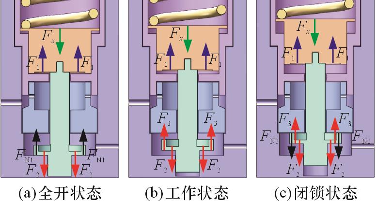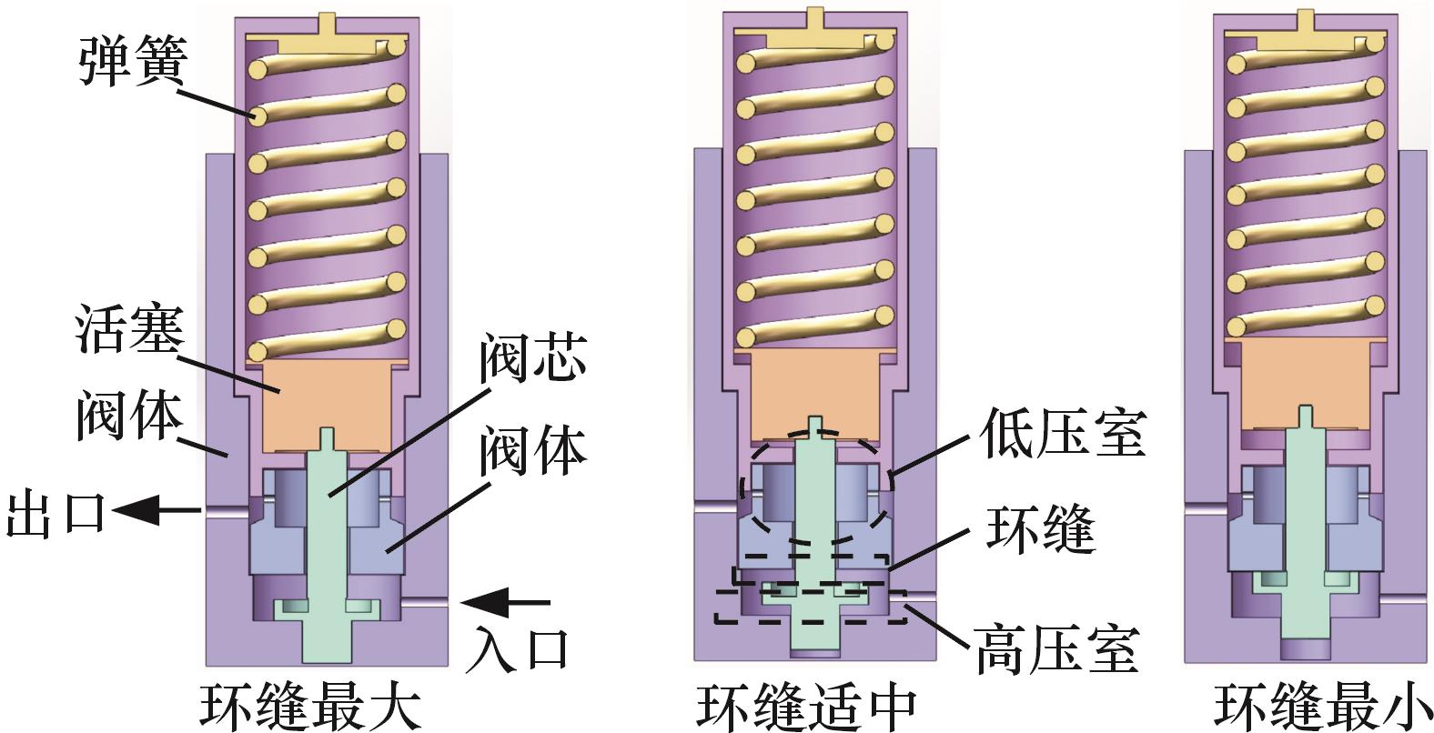 | 闭锁状态下启动(上游压力减小) | ![]() | 闭锁时环缝开度为0,阀后压力减小后,弹簧力使阀芯往下移动,节流环缝开度变大,阀后压力增大 |