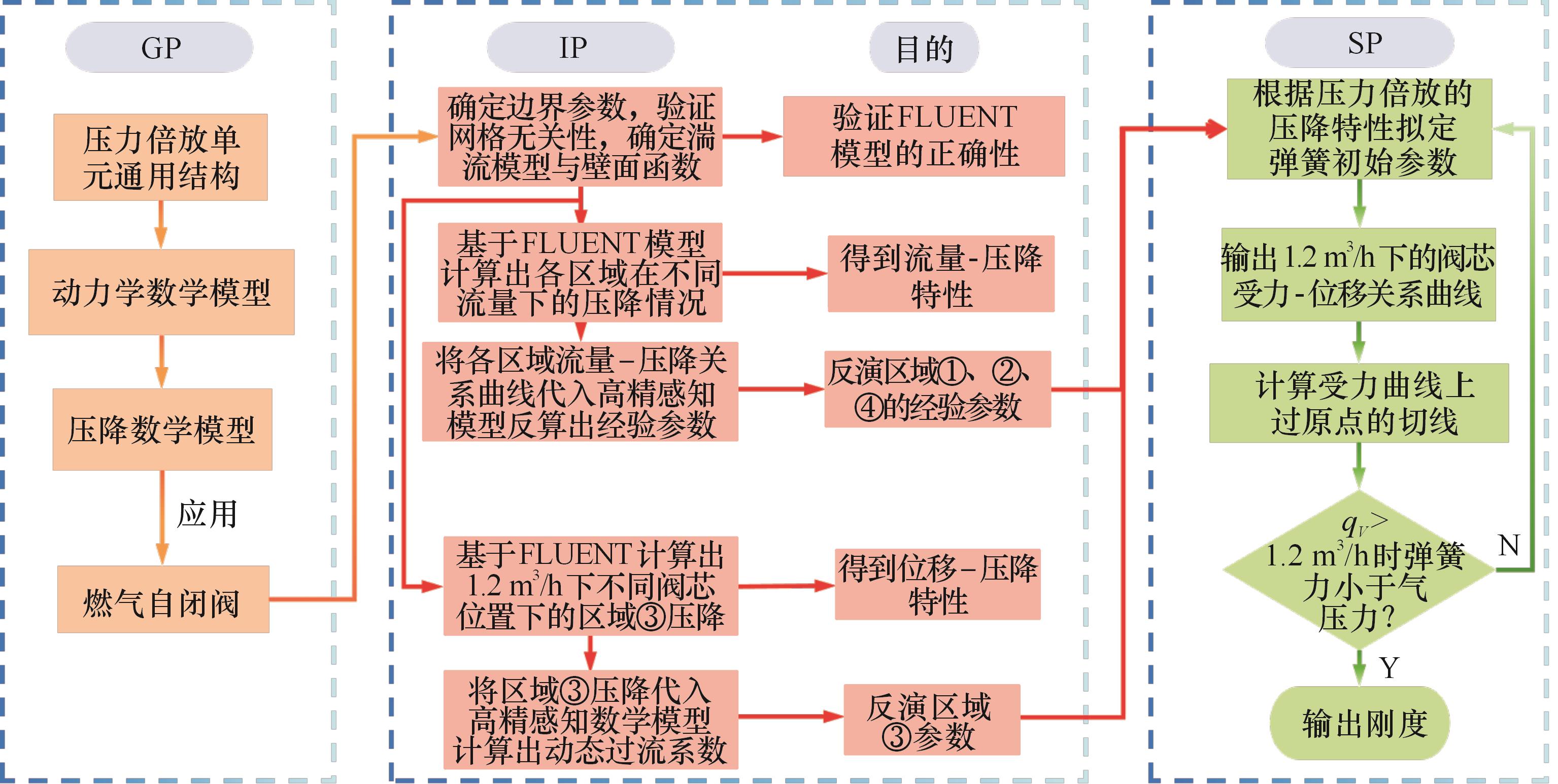 针对燃气泄漏工况下燃气自闭阀切断响应滞后的问题,设计了一种基于压力倍放效应的高精感知机构,旨在提高流量异常切断的精度。在通用参数化阶段,探讨了一种压力倍放感知机理并设计了相应的压力倍放单元结构,建立了其阀芯动力学模型和分区压降数学模型,揭示了微小流量变化触发指数级压降跃升的核心机制及弹簧刚度对响应特性的关键影响。在反演/具身参数化阶段,基于提出的“通用—反演—具身”参数推演方法进行关键参数优化:通过“反演参数化”结合FLUENT流场仿真数据,标定了压降数学模型中的关键经验参数;通过“具身参数化”聚焦目标切断流量,基于阀芯力-位移特性分析,优化求解出最佳弹簧刚度。研究证实,所提出的压力倍放单元及其通用—反演—具身的优化方法可为高精度燃气自闭阀的设计提供有效的理论依据与关键参数设计指导。