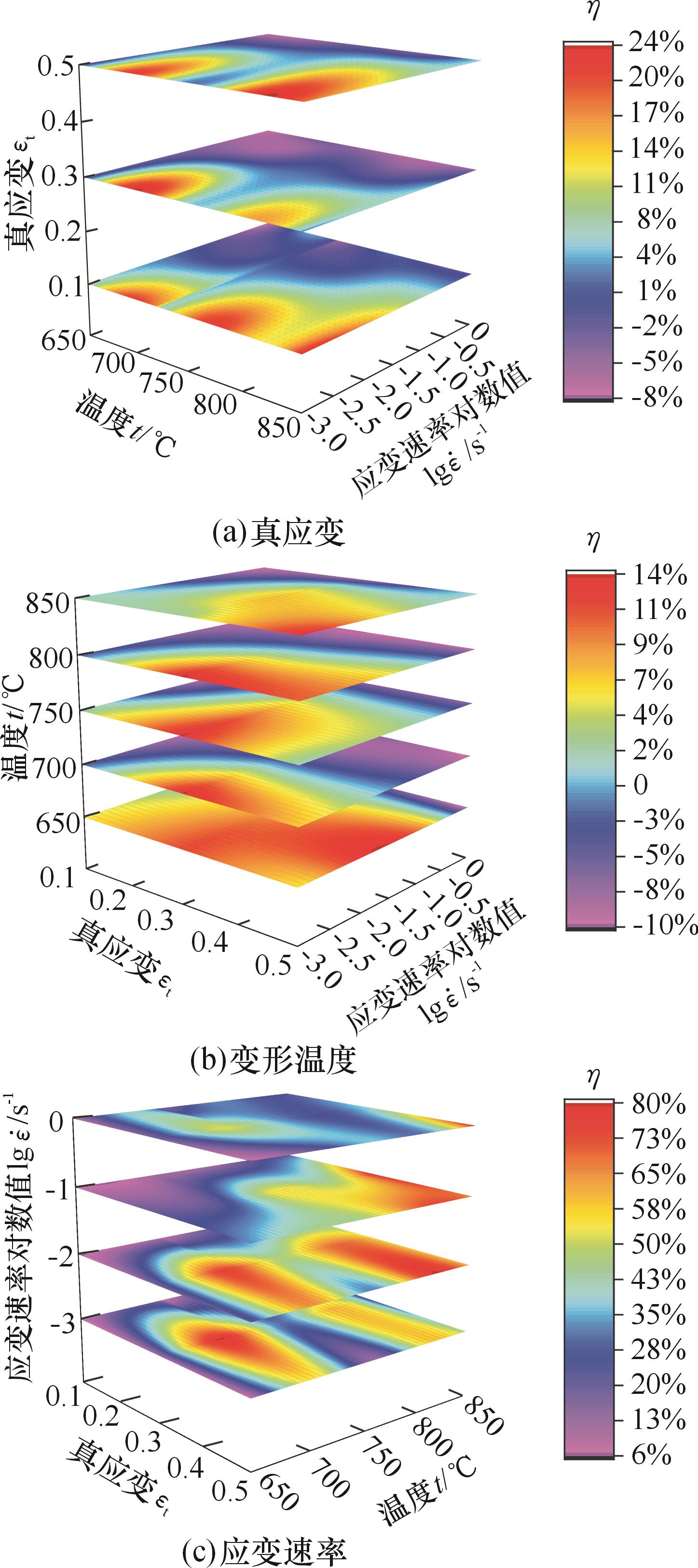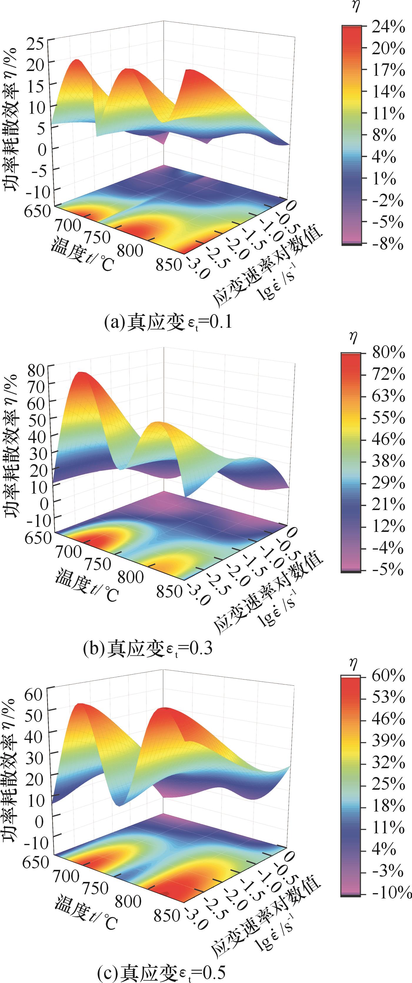 Fig.5 Three-dimensional distribution diagram of power dissipation efficiency for Ti2AlNb-based alloy under different strains