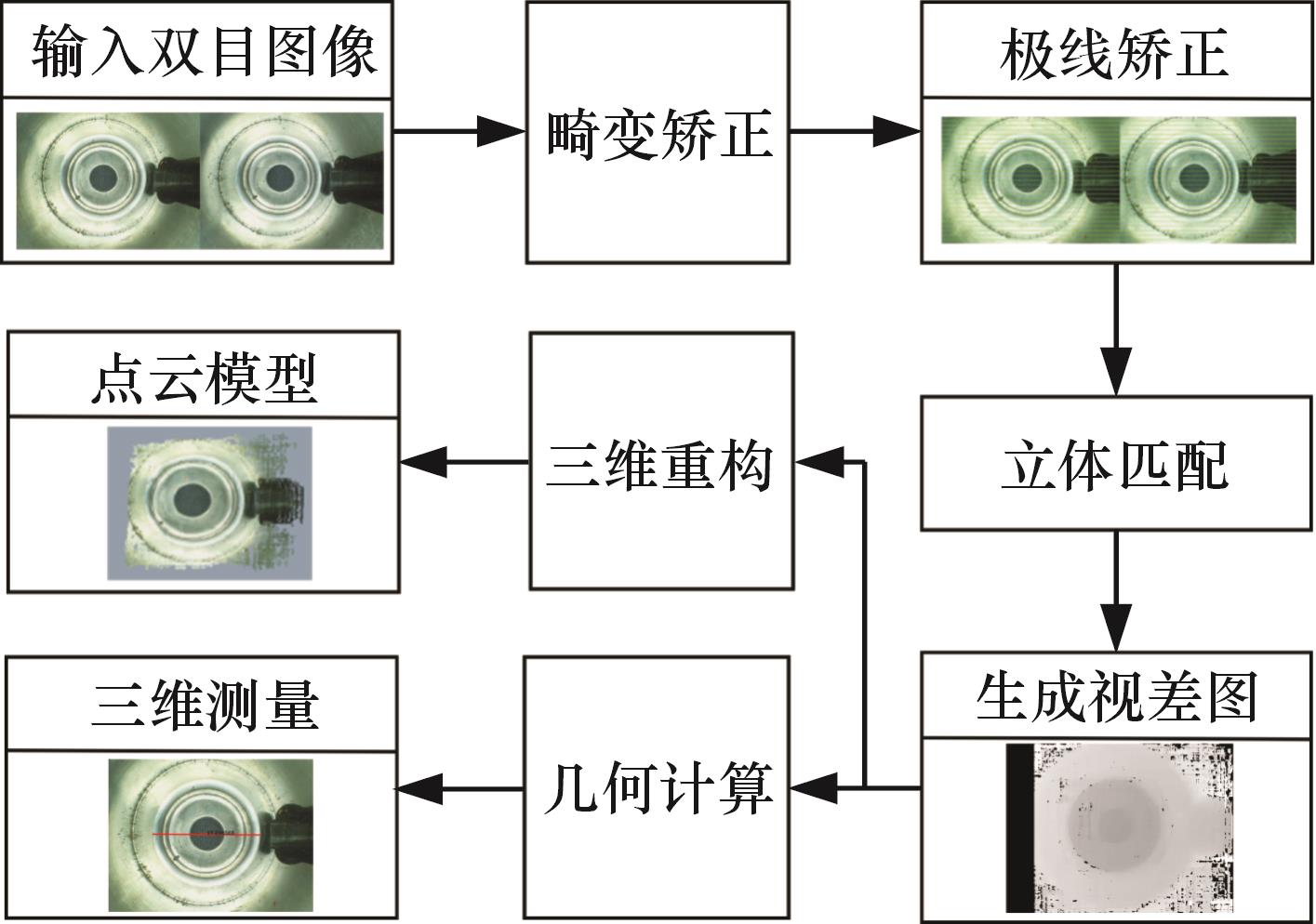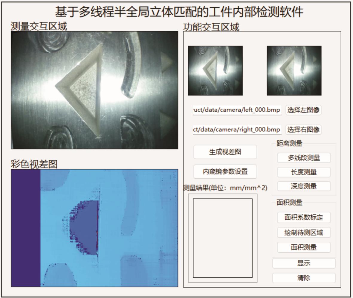 针对传统检测手段难以深入工件内部进行三维量化分析的问题,提出一种基于多线程半全局立体匹配(M-SGSM)的双目视觉检测方法。首先采用张正友标定法获取双目内窥镜参数,并对图像进行畸变矫正与极线矫正;然后设计多线程区域叠加分割策略优化立体匹配算法,提高视差图计算效率,生成三维彩色点云;最后,提出自标定面积测量法结合欧氏空间距离计算实现三维量化分析。实验结果表明,优化后立体匹配算法计算效率提高约30%,所提检测方法生成的三维点云结构清晰,欧氏距离测量误差小于3%,面积测量误差小于1.5%。该方法为工件内部三维检测提供了高效高精解决方案。