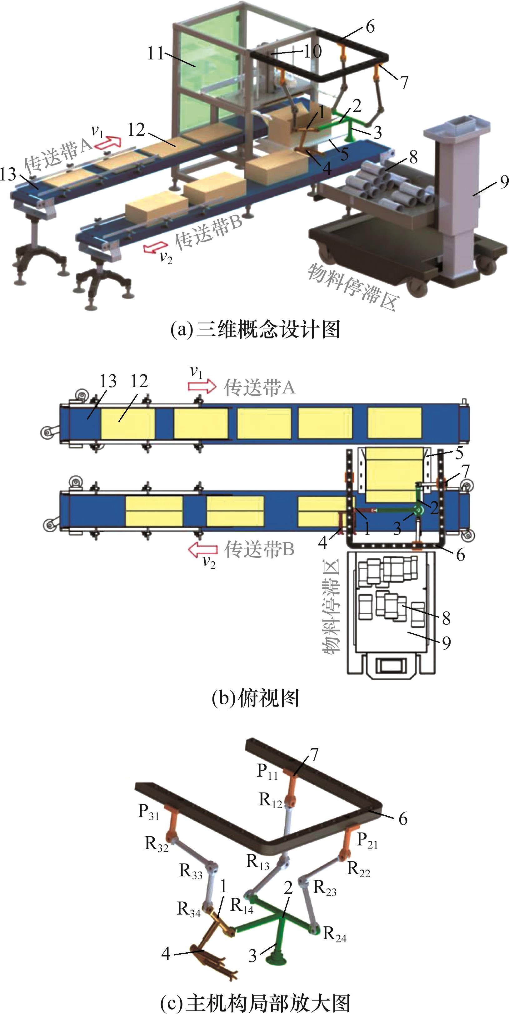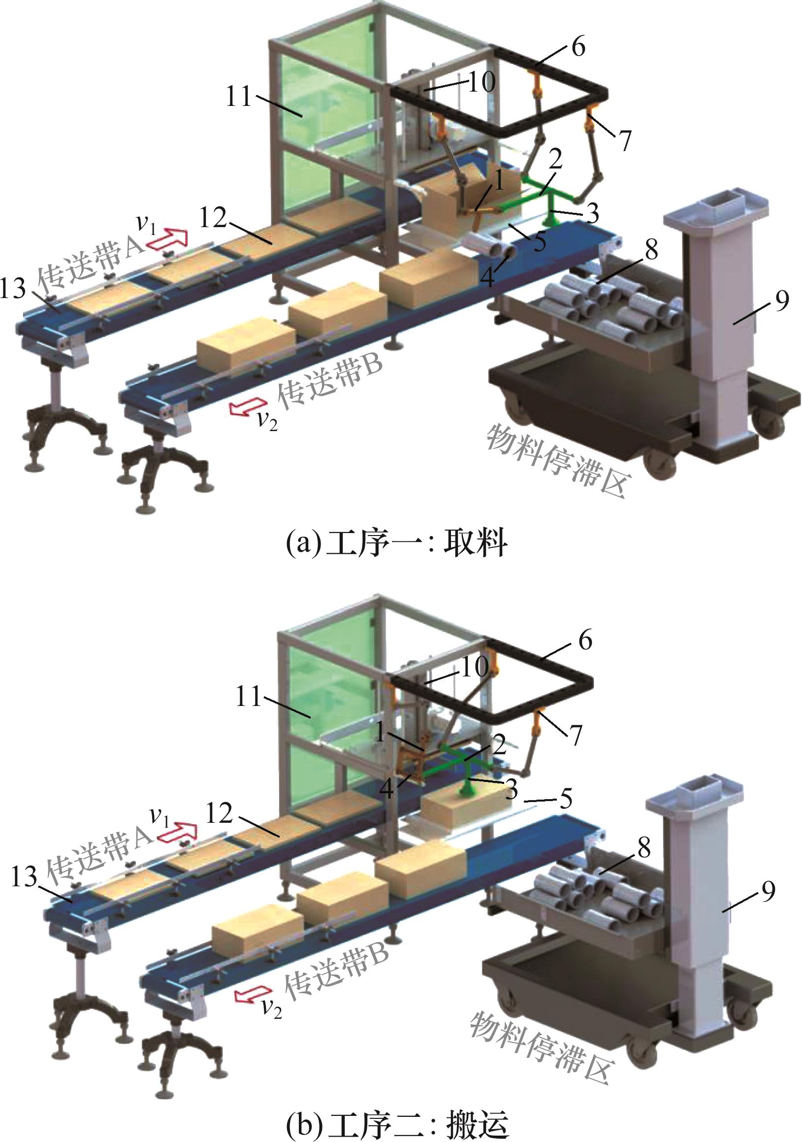 图14 应用场景概念设计图1.动平台1 2.动平台2 3.末端吸盘 4.末端旋转撑手5.纸箱承托平台 6.导轨 7.滑块8.涡轮洗衣机滚筒 9.运料车 10.气动机械手11.套袋封箱机 12.折叠纸箱 13.传送带