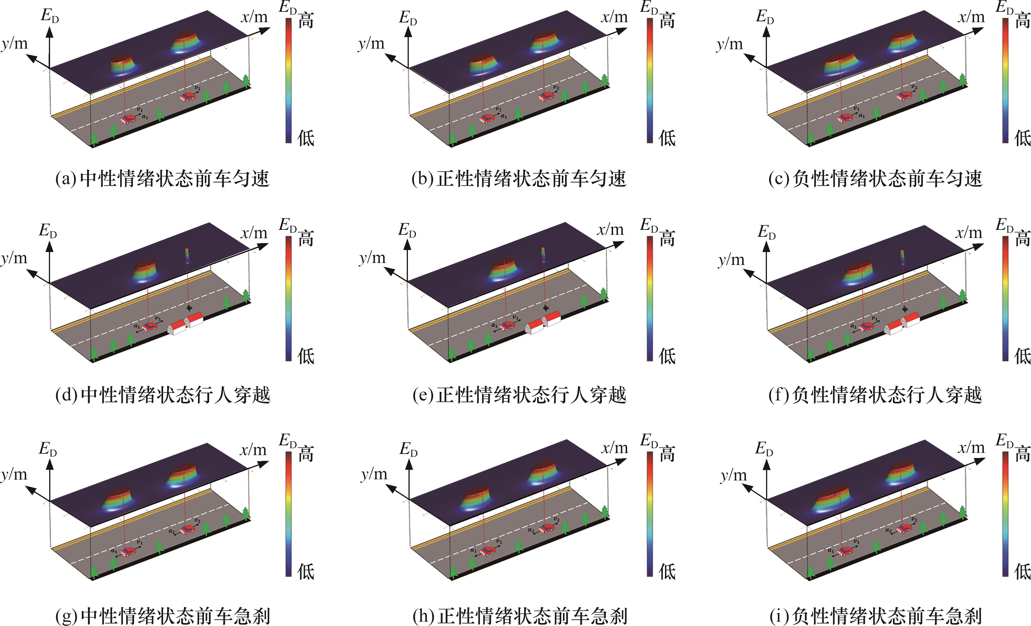 图12 不同情绪下HF-CRF三维示意图(ED为人因行为场场强)