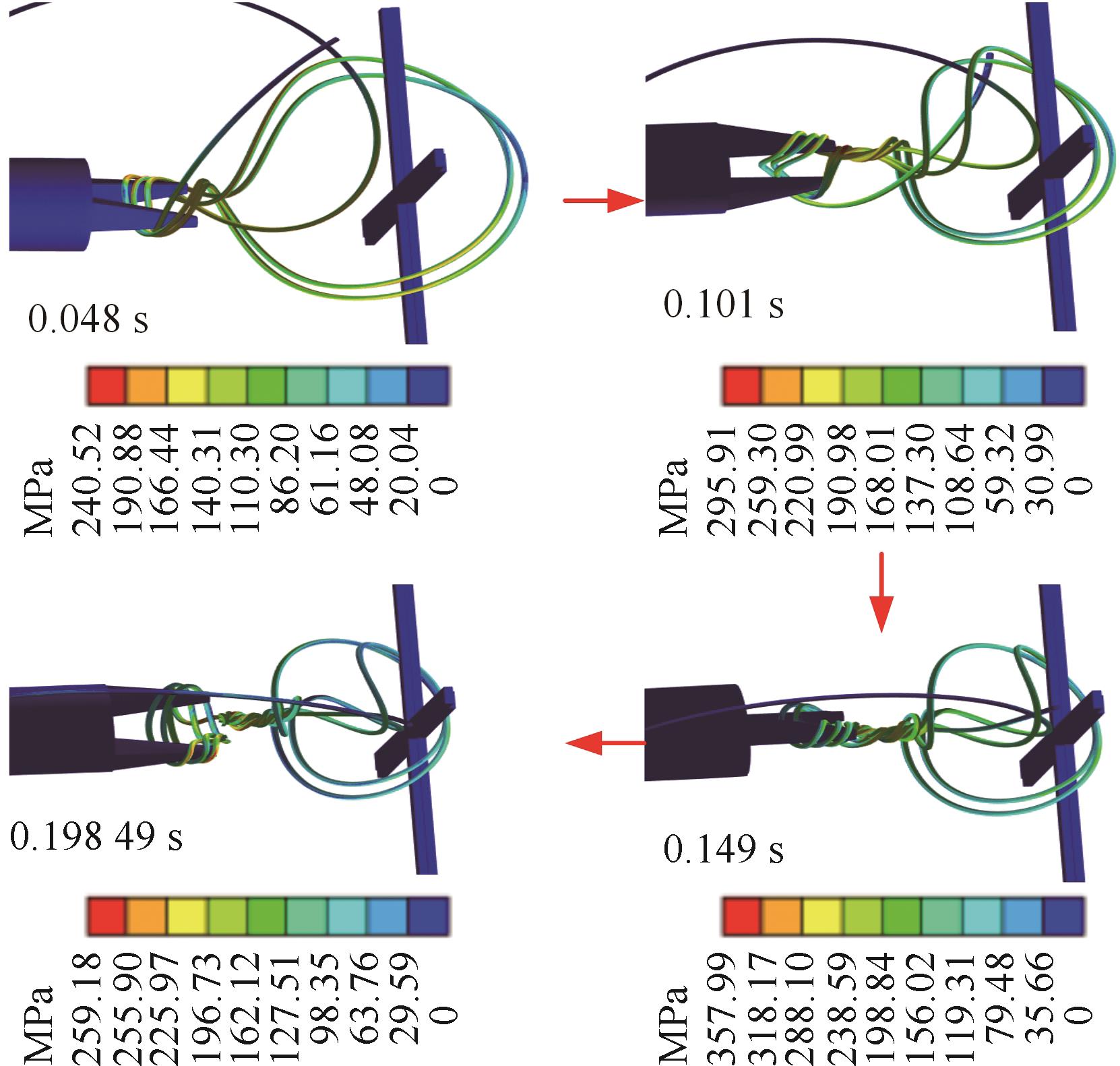 为提高锚网绑扎效率及质量,设计了一种锚网自动绑扎装置。基于发明问题解决理论对手持执行器、动力驱动装置、软轴传动机构进行了结构设计,并建立了锚网自动绑扎装置的三维模型。建立了无刷直流电机可换向调速控制系统模型,电机响应速度、输出扭矩均满足绑扎需求。分析了软轴扭转角,发现最大扭转角为49.560°,电机运行滞后时间为0.017s。依据设计参数制作了样机,10组锚网绑扎测试的平均绑扎时间为1.8 s,装置各机构动作与仿真结果相符。