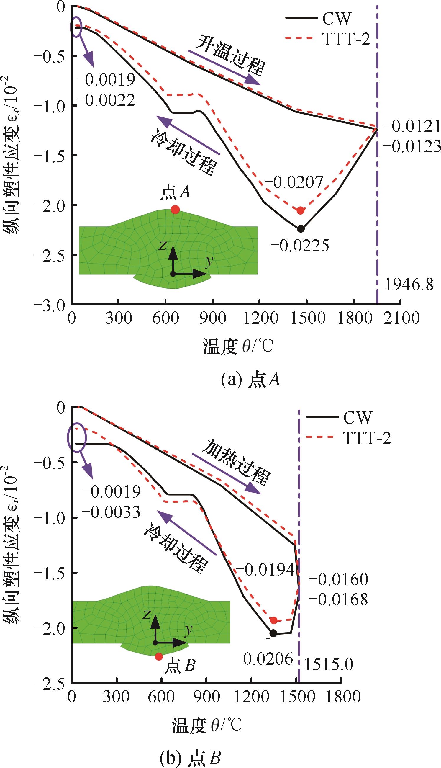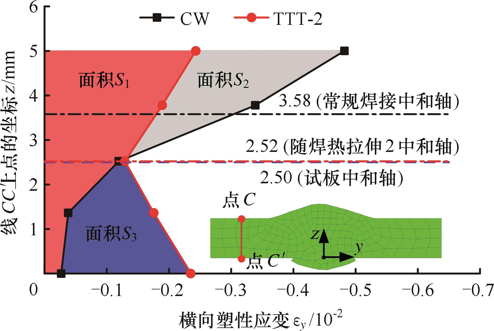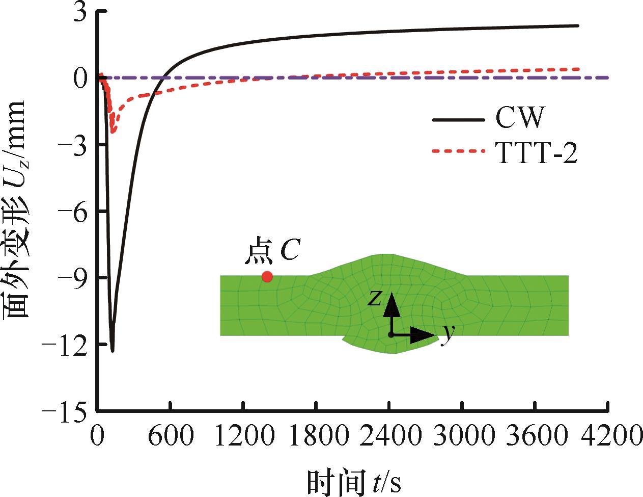 The welding buckling distortion in thin plates of high-strength steels AH36 seriously affected the manufacturing accuracy and was difficult to be completely eliminated by means of correction after welding. TTT was an effective method to control buckling distortion during thin plates welding. A TTT platform was built with induction heating as the auxiliary heat source to conduct conventional welding and TTT experiments in thin plates of high-strength steels AH36 . After the joints were cooled to room temperature, welding distortion was measured by the three-coordinate measuring machine. The maximum relative out-of-plane deformation is as 23.88 mm under conventional welding, and decreases to 13.68 mm under TTT processes. Subsequently, the FE model of butt welded joint was established and thermal elastic plastic FE analyses were carried out for conventional welding and TTT processes. The results are in good agreement with the measured ones. Meanwhile, the maximum relative out-of-plane deformation could be reduced to 4.42 mm with modifying the temperature during TTT processes. Finally, the causes of welding buckling distortion and the control mechanism of TTT during thin plates welding processes with high-strength steels AH36 were clarified based on the welding inherent strain theory. The thermal tensile action formed by the auxiliary heat source changes the constraint degree of the base materials on the weld, which results in less compressive plastic strain during the heating processes and more tensile plastic strain during the cooling processes, so that the inherent strain at the weld is decreased. The tendon force is reduced by 26.4%. The reduction of instantaneous deformation decrease the transverse inherent bending moment by 95.2%, which reduces the initial disturbance resulting in welding buckling distortions, so as to further control the welding buckling distortion of thin plate structures.