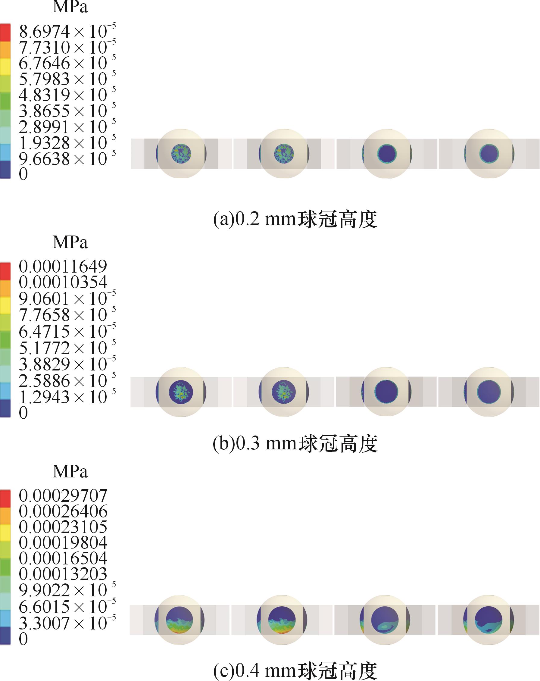 | 球冠高度/mm | 最大摩擦应力/kPa | 平均摩擦应力/kPa | 最大等效应力/kPa | 平均等效应力/kPa | |