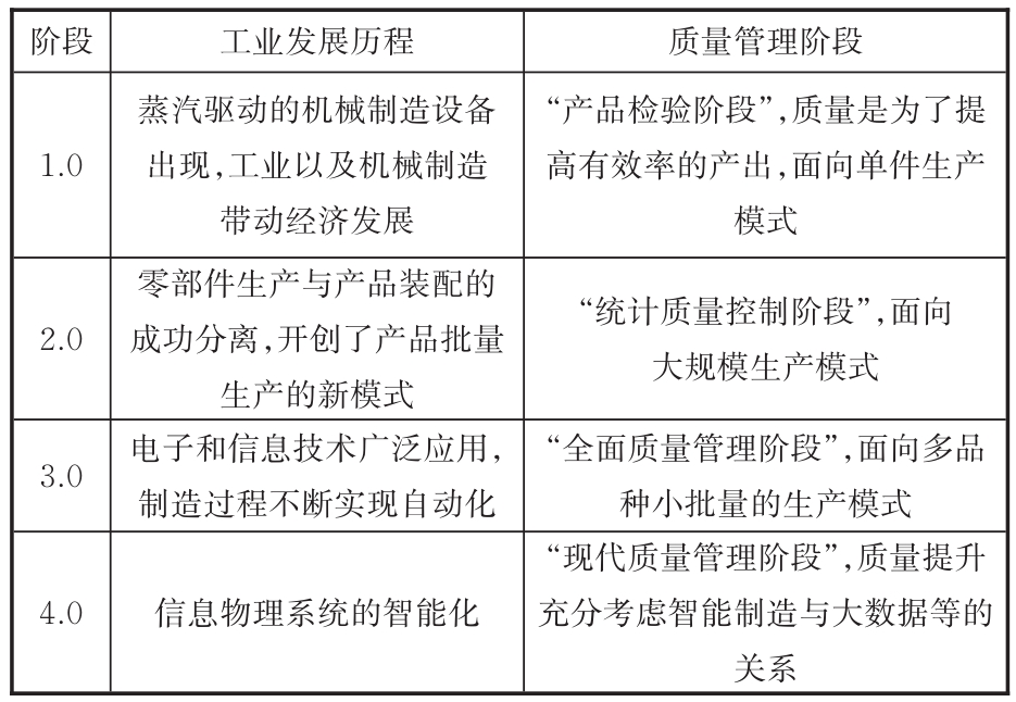 工业革命与质量发展路径密不可分,如果把质量管理也分为4个阶段,可以看到每个阶段质量管理随着工业革命的发展特征,也表现出不同的特点,如表1所示。