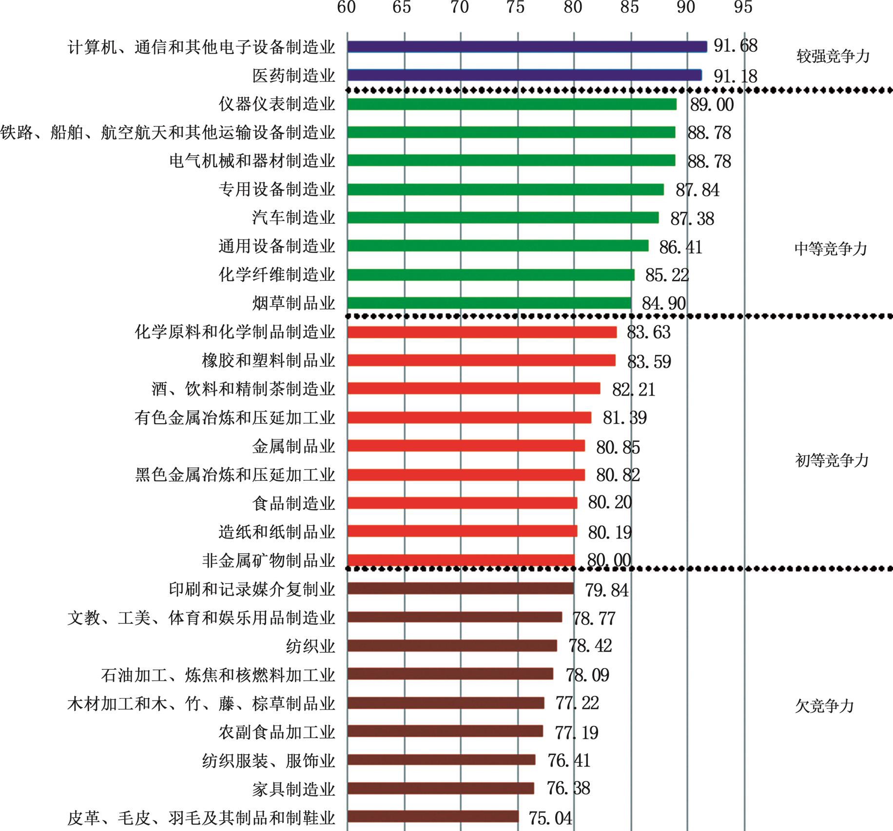 神舟飞天、嫦娥探月,创新缔造中国高度;蛟龙入水、海上钻探,创新成就中国深度;高铁飞驰、天河运转,创新改写中国速度。质量是我国制造业突破瓶颈的关键。多年来,我国制造业虽然取得了“上天”、“入地”、“下海”的巨大成就,但产品质量不高问题却一直未得到根本解决,突出表现在:一些领域基本的复合性质量问题仍大量存在,导致一些产品质量常年不合格;一些装备的关键材料、基础部件、核心系统质量不稳定或是可靠性不高,必须依赖进口,导致研制生产长期受制于人;一些产业缺乏高端、高质量产品研发设计能力,只能定位于生产低端低附加值产品。从行业角度看,如图1所示,我国仅有少数行业步入较强竞争力发展阶段,而多数行业均处在中等竞争力、初等竞争力和欠竞争力阶段,各行业质量指数差异较大。