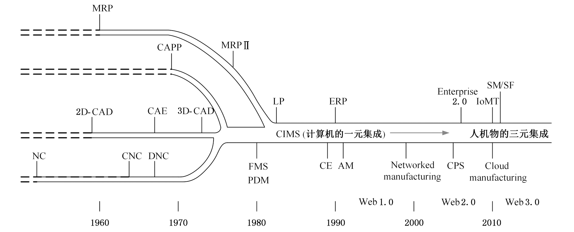 为优化工艺过程设计,20世纪60年代后期出现了计算机辅助工艺规划(computer aided process planning,CAPP)[9]。CAD、CAM、CAPP组成的工程设计自动化系统具有产品的概念设计、工程分析、结构与工艺设计及数控编程功能[10],上述技术的综合运用在20世纪80年代初出现的柔性制造系统(flexible manufacture system,FMS)上得到了体现[11]。20世纪80年代初期出现的产品数据管理(product data management,PDM)解决了大量工程图纸文档的管理困境,并逐步扩展为产品开发全生命周期的数据管理[12],进一步完善处理CAD/CAM系统存在的数据管理问题。20世纪60年代,库存物资管理问题引起了制造业对物料管理的思考,进而发展出物料需求计划(material requirement planning,MRP),并在此基础上发展出闭环的MRP。20世纪70年代,制造资源计划(manufacturing resource planning,MRP Ⅱ)应用管理会计的概念来实现对物资信息与资金信息的集成,并于20世纪90年代扩展为更为全面的企业资源计划(enterprise resource planning,ERP)[13]。