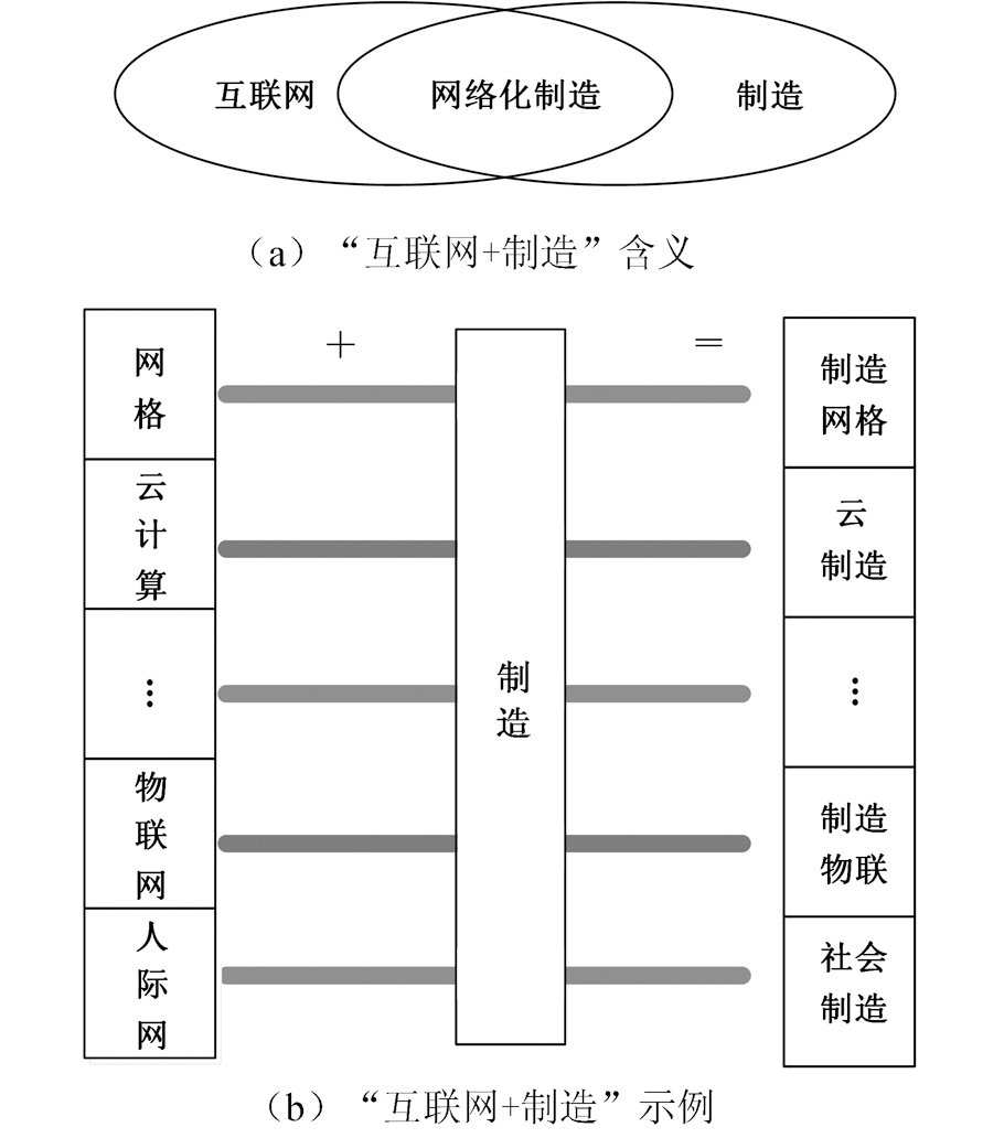 “互联网+制造”代表互联网与制造的融合,这里的“+”既包含“加”、也包含“减”的含义。所谓“加”,就是充分发挥互联网在生产要素配置中的优化和集成作用,盘活存量和提升生产效率;所谓“减”,就是去掉信息化孤岛或障碍,淘汰落后产能和简化生产流程。如果用集合来表示, “互联网+制造”可视为互联网与制造的交集,即“互联网+制造”等同于“制造+互联网”[4],这种融合亦称为互联网制造(网络化制造),如图1a所示。具体形式上,既有早期“制造+网格”发展出的制造网格,也有新兴“制造+物联网”所形成的制造物联(网)[5],如图1b所示。从更广泛意义来说,就有“工业+互联网”衍生出工业互联网。