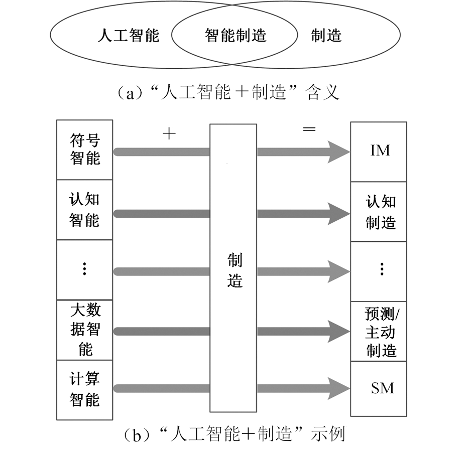 “人工智能+制造”代表人工智能与制造的融合,如图3所示。最初体现为诞生于20世纪80年代的智能制造(intelligent manufacturing,IM)。此时的AI主要依靠符号智能实现决策,因此IM主要依赖人类专家知识来解决制造中的问题。近些年来,得益于新一代AI的发展,特别是以“大数据+深度学习”为代表的大数据智能的发展,诞生了新一代智能制造(多用smart manufacturing(SM)表示)[23-24]。